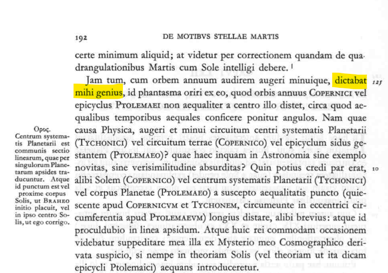The terminal point while tracing this back is the multi-volume collected works of Kepler published by C. H. Beck in Munich where the phrase dictabat mihi genius appears in the following paragraph